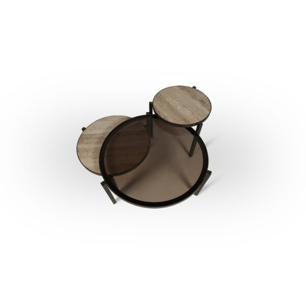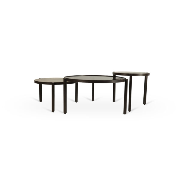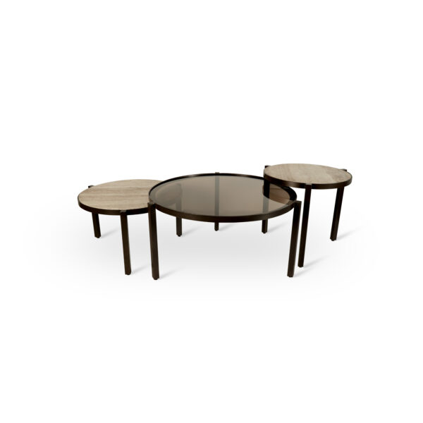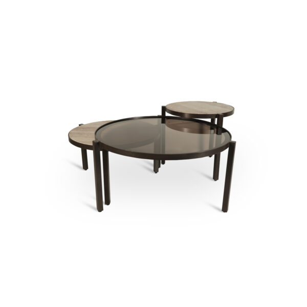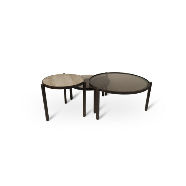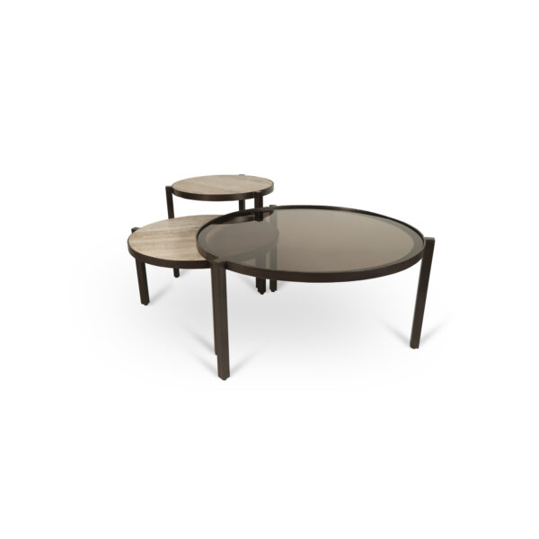 De ECLIPSE salontafel set is geïnspireerd op balans en beweging. De drie tafels vormen samen een gelaagde compositie die visueel ritme en diepte toevoegt aan de leefruimte.